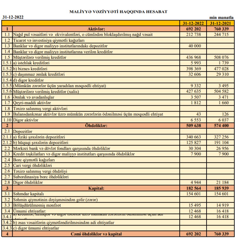 Müqayisə üçün qeyd edək ki, 2021-ci ildə Bankın əməliyyat gəlirləri (faiz və qeyri-faiz gəlirləri) 47 milyon 112 min manat, əməliyyat xərcləri (faiz və qeyri-faiz xərcləri) 47 milyon 826 min manat, xərclər gəlirləri üstələdiyindən əməliyyat zərəri 714 min manat təşkil etmişdi.