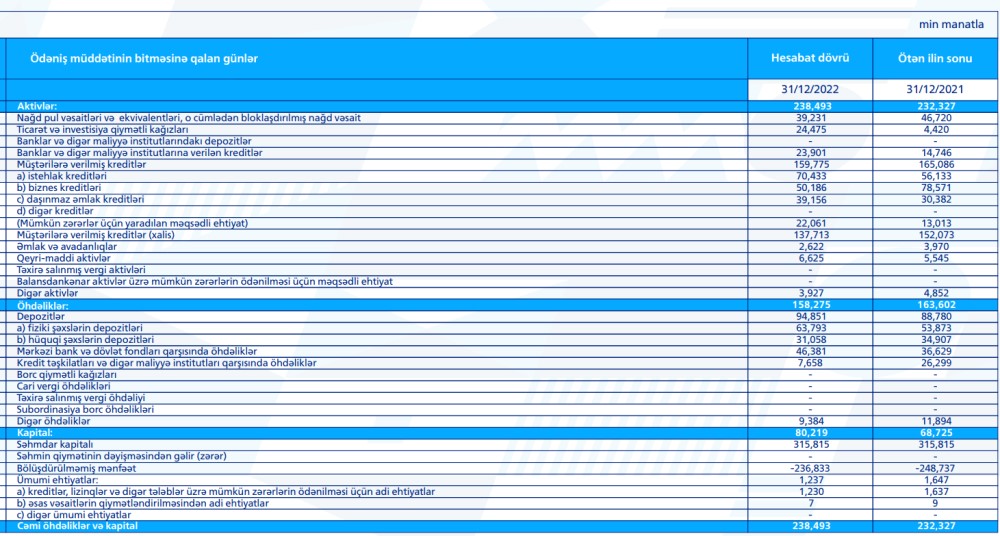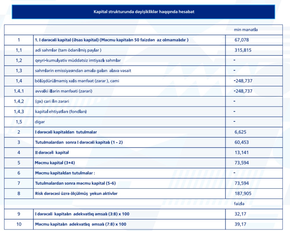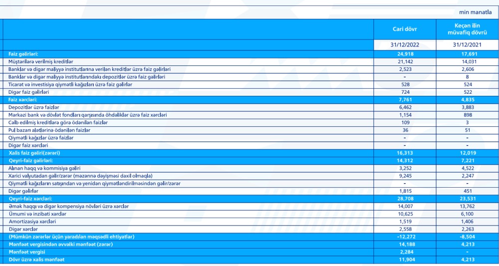 Müqayisə üçün qeyd edək ki, 2021-ci ildə "VTB Azərbaycan"ın cəmi əməliyyat gəlirləri 24 milyon 912 min manat, əməliyyat xərcləri 28 milyon 366 min manat, əməliyyat zərəri 4 milyon 291 min manat təşkil etmişdi. Mümkün zərərlərin ödənilməsi üçün yaradılmış xüsusi ehtiyatdan azad olmuş 8 milyon 504 min manatın hesabına zərər bağlanmışdı.