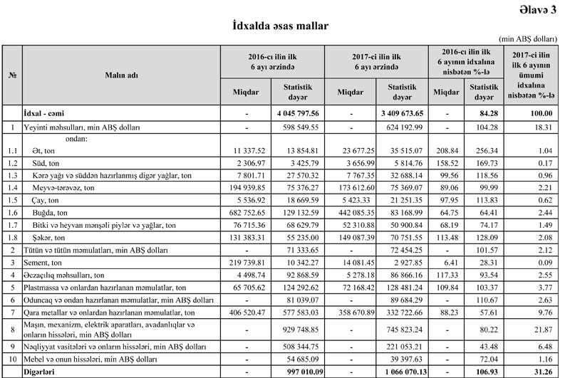 Yeyinti məhsulları Azərbaycanın idxalının 18%-ni yaradır.