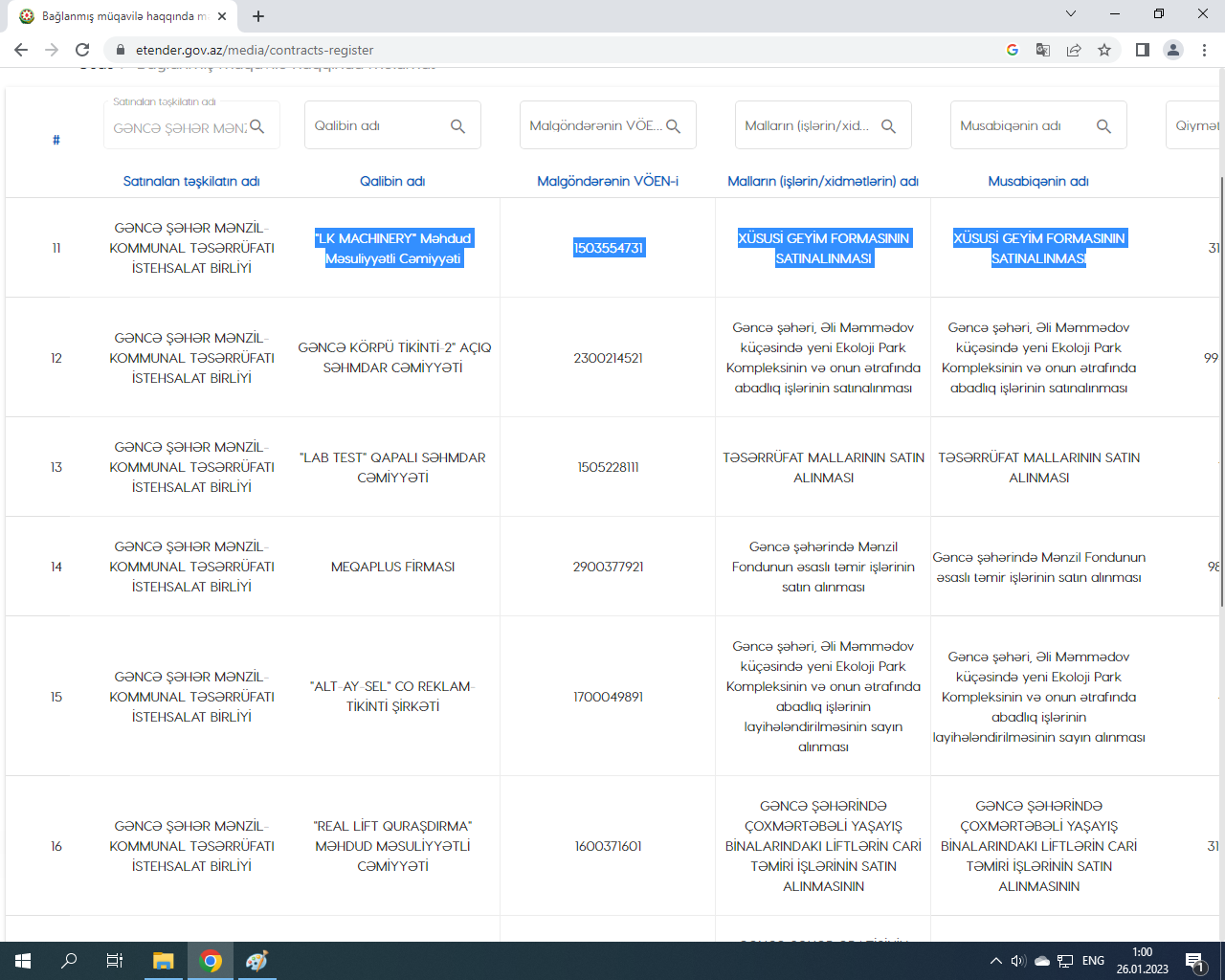 Orxan İsmayılov Marja.az-a bildirib ki, araşdırması zamanı, tenderlərdə qalib elan edilən “LK Machinery” MMC üçün göstərilən VÖEN-in (1503554731) əslində "Abşeron Tekstil” MMC-yə məxsus olduğunu aşkar edib.