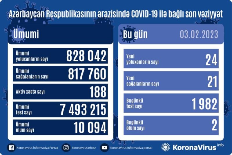 Azərbaycan Respublikasında koronavirus (COVID-19) infeksiyasına 24 yeni yoluxma faktı qeydə alınıb, 21 nəfər müalicə olunaraq sağalıb.