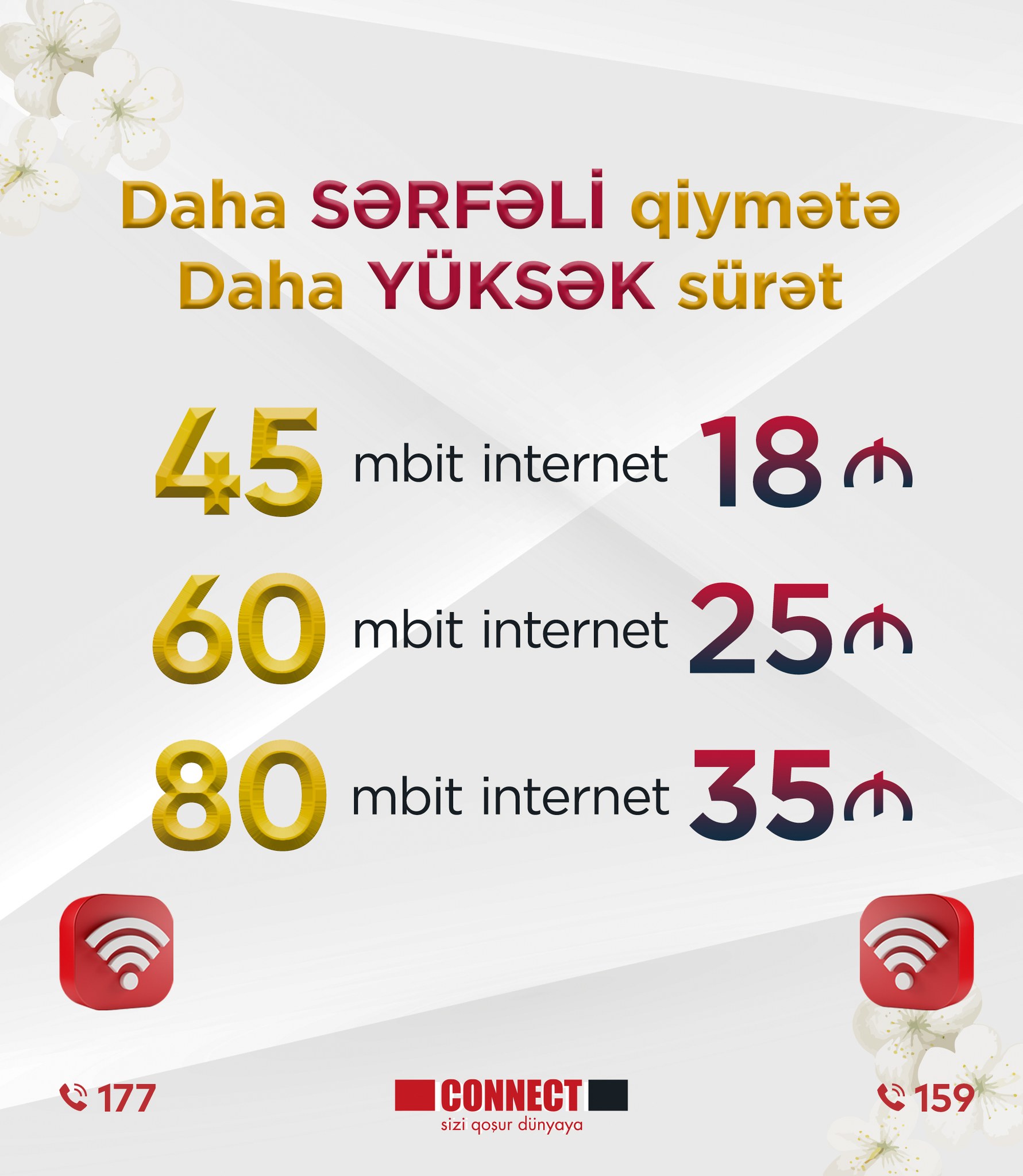 Marja xəbər verir ki, yeni tariflərə görə, 45 Mb/san 18 manata, 60 Mb/san 25 manata, 80 Mb/san 35 manata təklif olunur.