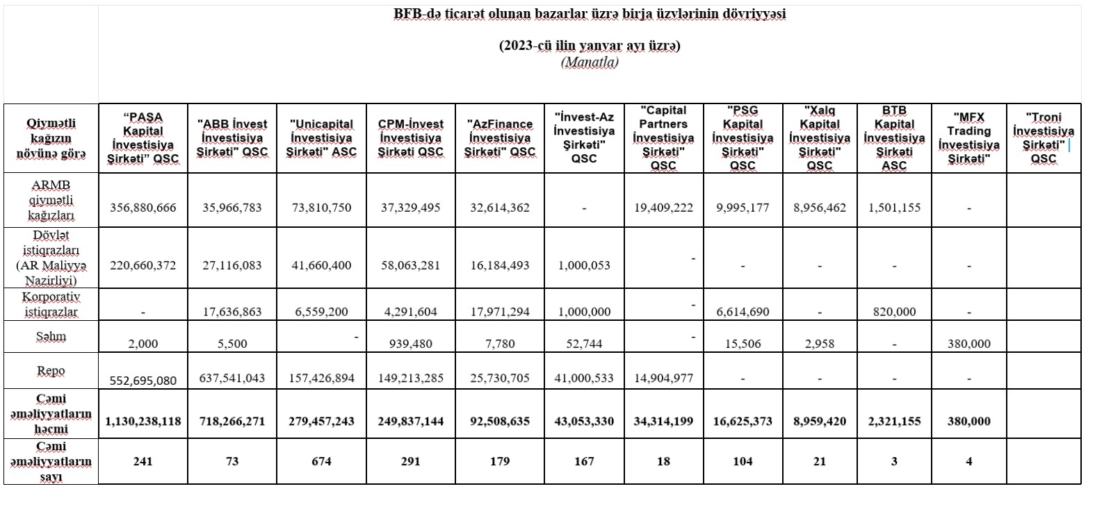 Marja Birja-ya istinadən xəbər verir ki, 2023-cü ilin yanvar ayında 1 milyard 130 milyon 238 min 118 manat dövriyyə ilə “PAŞA Kapital İnvestisiya Şirkəti” QSC 1-ci, 718 milyon 266 min 271 manat dövriyyə ilə "ABB İnvest İnvestisiya Şirkəti" QSC 2-ci və 279 milyon 457 min 243 manat dövriyyə ilə "Unicapital İnvestisiya Şirkəti" ASC 3-cü yerdə olub.