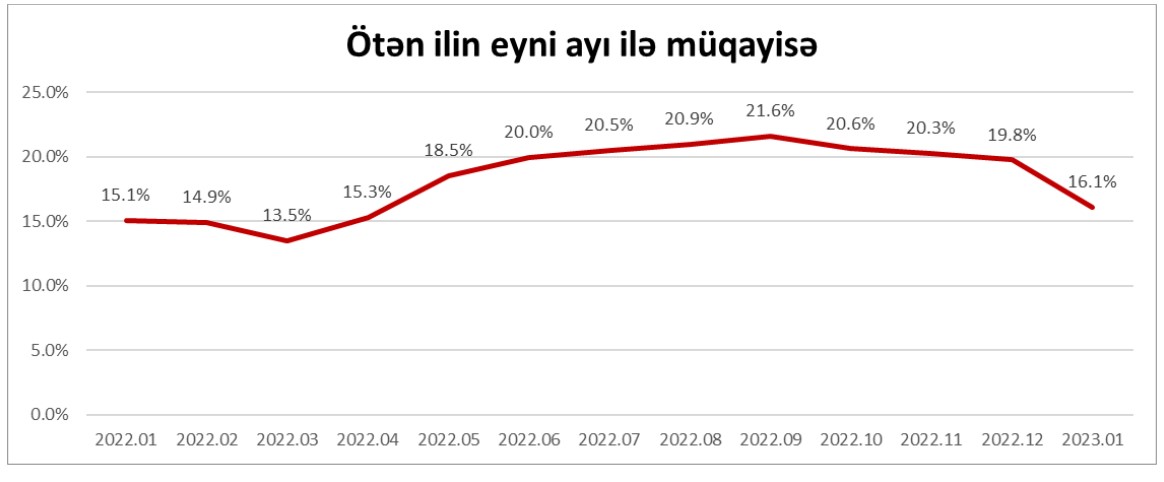 Belə ki, tez köhnələn qida məhsullarının qiymətində keçən ilin yanvar ayına nisbətən 15.9% artım, quru, dondurulmuş qida məhsullarının, şirniyyat və spirtsiz içkilərin qiymətində 20.7% artım, spirtli içkilər və tütün məmulatlarının qiymətində 5.2% artım izlənilib.