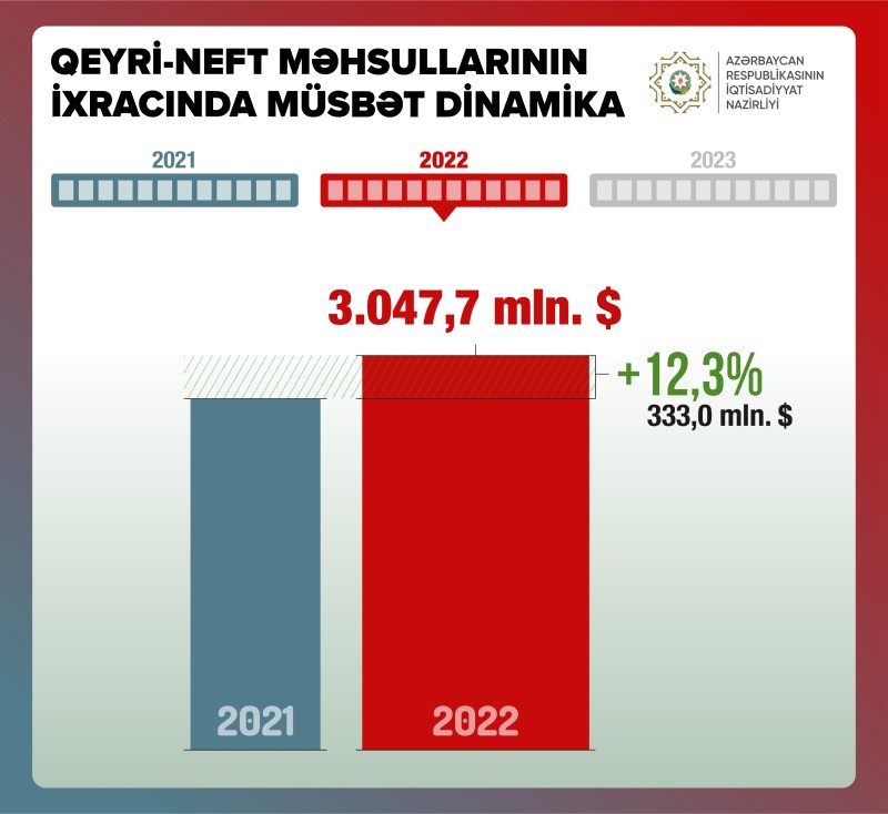2022-ci il ərzində qeyri-neft məhsullarının ixracı əvvəlki ilə nisbətən 12,3% artaraq 3 milyard 48 milyon dollar təşkil edib.