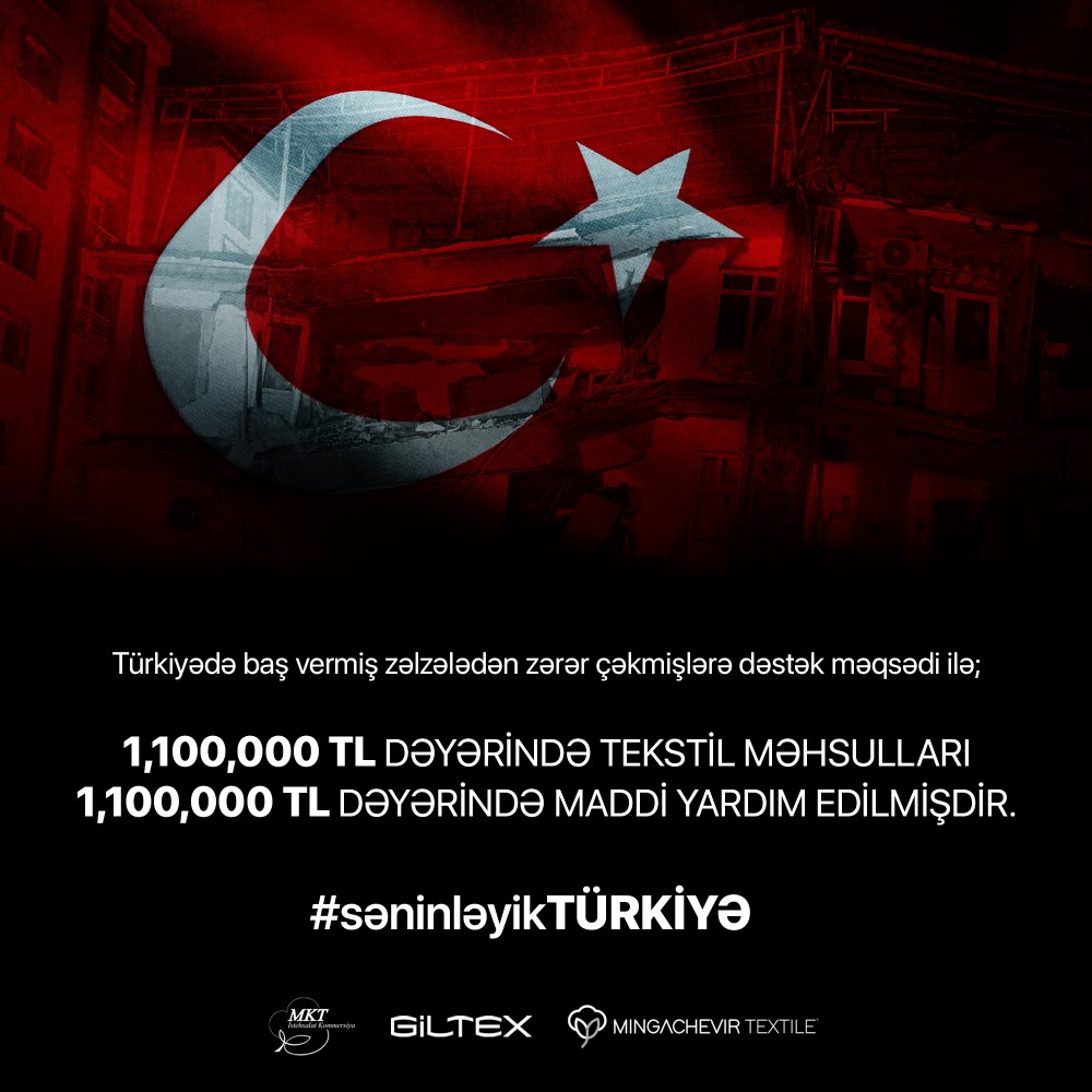 “MKT İK” MMC, “GİLTEX” MMC və “Mingəçevir Tekstil Parkı” MMC-nin daxil olduğu "GP COTTON" şirkətlər qrupu Türkiyənin cənub şərqində baş vermiş zəlzələdən zərər çəkmiş şəxslərə yardım məqsədi ilə Türkiyənin Fövqəladə Halların İdarə Olunması Agentliyinə (AFAD) 1,100,000 türk lirəsi (TL) (cari məzənnə ilə 100 min AZN) dəyərində maddi yardım və 1,100,000 türk lirəsi (TL) məbləğində günlük ehtiyac malları (yorğan, isti corab, qalın gödəkçə və s.) ianə edib.