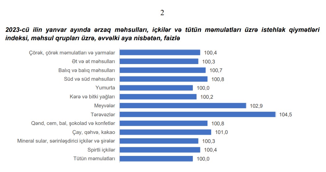 Komitənin məlumatında qeyd edilib ki, 2023-cü ilin yanvar ayında ərzaq məhsulları, içkilər və tütün məmulatları üzrə istehlak qiymətləri indeksi əvvəlki aya nisbətən 1,2 faiz artıb.