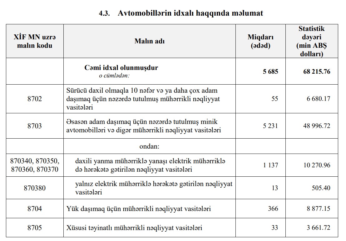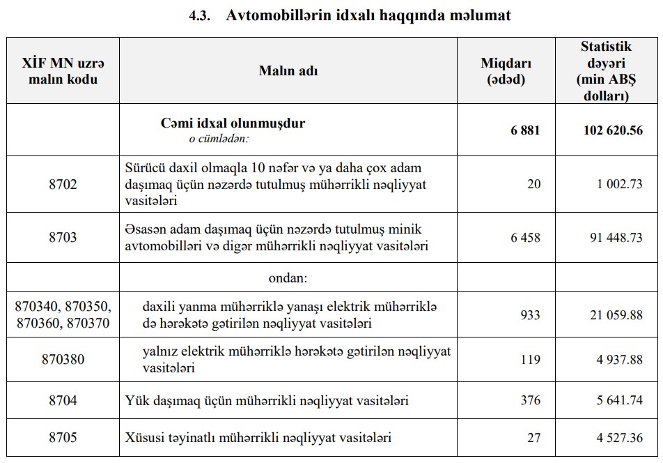 Minik avtomobillərinin idxalı 5 min 231 ədəddən (Yanvar 2022) 6 min 458 ədədə (Yanvar 2023), elektrik avtomobillərinin idxalı isə 13 ədəddən (Yanvar 2022) 119 ədədə (Yanvar 2023) yüksəlib. Beləliklə, elektrik avtomobillərinin idxalı 9 dəfədən çox artıb