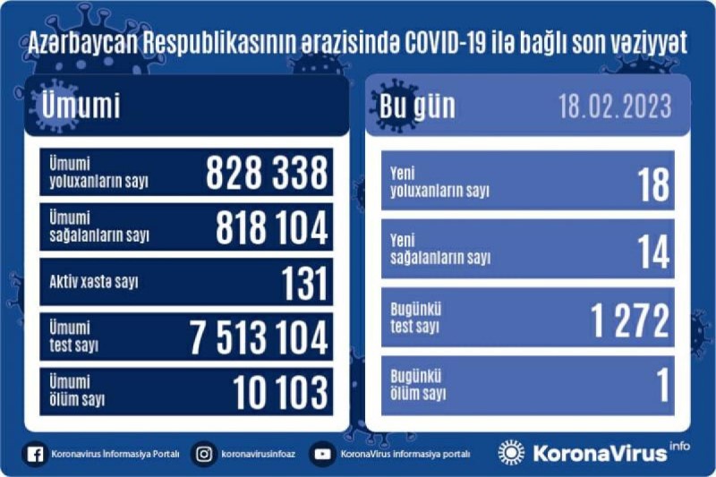 Azərbaycan Respublikasında koronavirus (COVID-19) infeksiyasına 18 yeni yoluxma faktı qeydə alınıb, 14 nəfər müalicə olunaraq sağalıb.