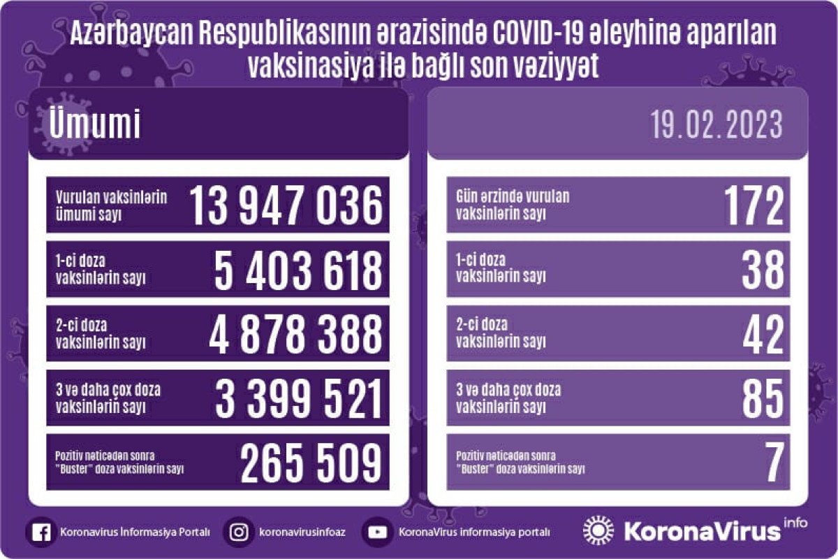 Azərbaycanda son sutkada koronavirus (COVID-19) əleyhinə 172 vaksin vurulub. Bir gündə birinci mərhələ üzrə vaksinasiya olunanların sayı 38, ikinci mərhələ üzrə vaksinasiya olunanların sayı 42, üç və daha çox doza üzrə vaksinasiya olunanların sayı 85, pozitiv nəticədən sonra buster doza üzrə vaksinasiya olunanların sayı 7 nəfərdir.