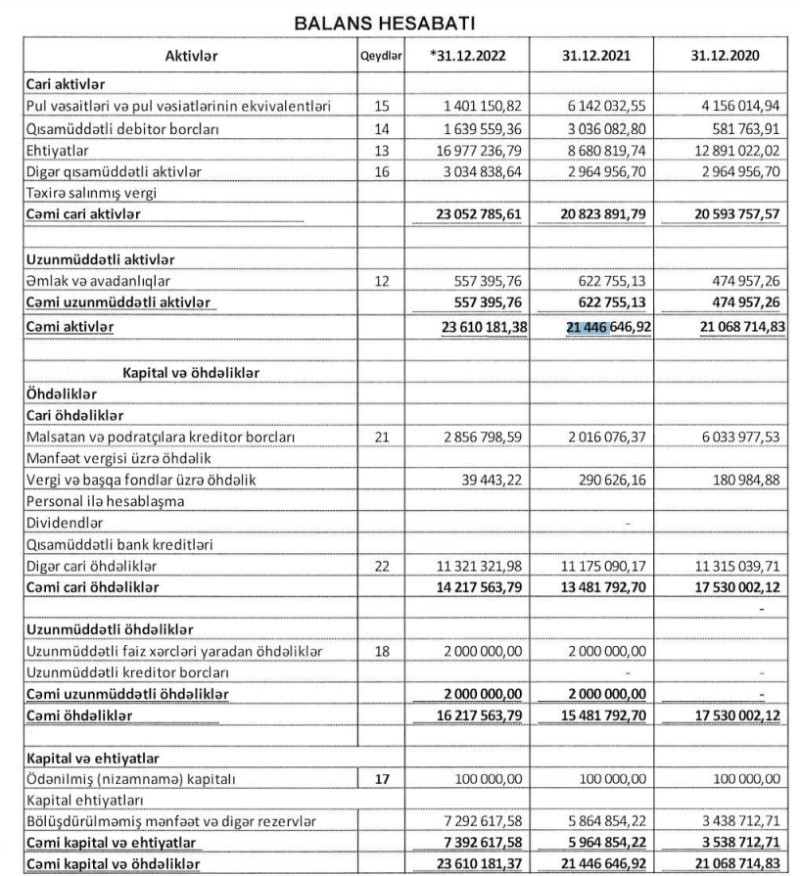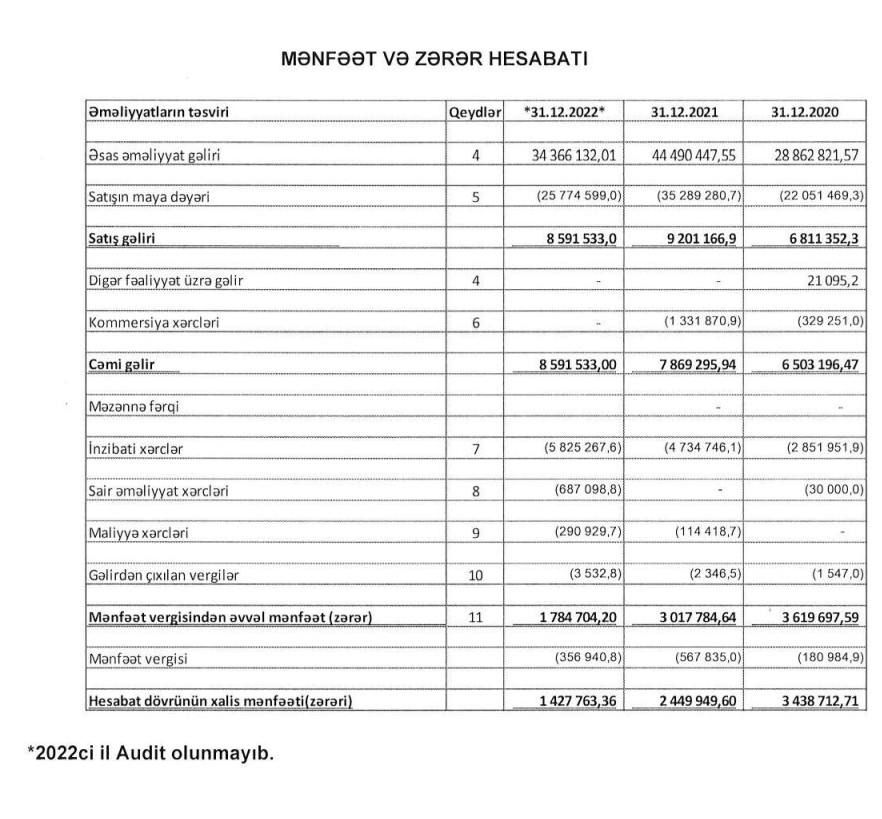 "Aqrar İnnovasiya və Təchizat Şirkəti” ASC 2022-ci ili 1 milyon 428 min manat xalis mənfəət ilə başa vurub.