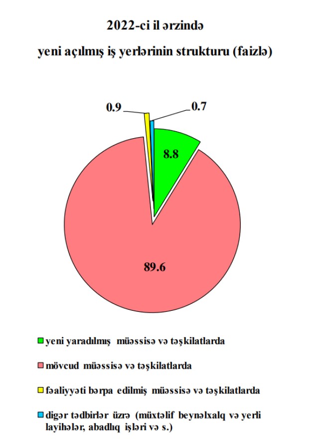 Yeni açılmış iş yerlərinin 8,8 faizi yeni yaradılmış müəssisə və təşkilatlarda, 89,6 faizi mövcud müəssisə və təşkilatlarda, 0,9 faizi fəaliyyətini bərpa etmiş müəssisə və təşkilatlarda, 0,7 faizi isə digər tədbirlər üzrə yaradılmışdır.