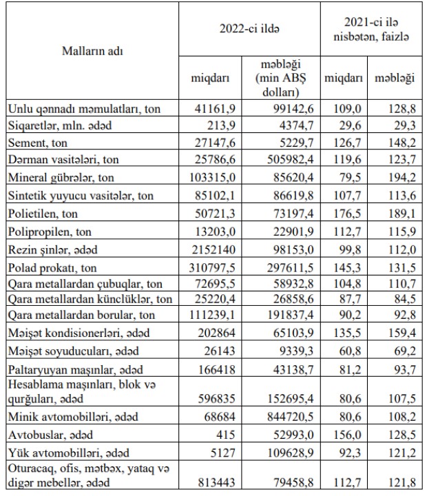 2022-ci ildə Azərbaycana məişət soyuducularının və paltaryuyan maşınların idxalı azalıb.