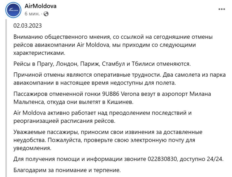 “Air Moldova” aviaşirkəti Praqa, London, Paris, İstanbul və Tbilisi şəhərləri istiqamətində uçuşları ləğv edib.
