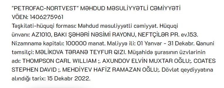 Dövlət Vergi Xidməti "PETROFAC-NORTVEST" MMC-ni dövlət qeydiyyatına alıb.