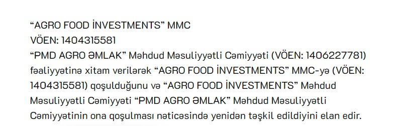 Marja.az xəbər verir ki, fəaliyyətinə xitam verilən "PMD Agro Əmlak" şirkəti "Agro Food İnvestments" MMC-yə qoşulub.