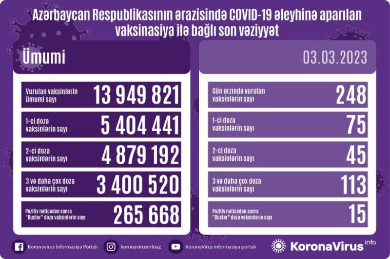 Azərbaycanda son sutkada koronavirus (COVID-19) əleyhinə 248 vaksin vurulub. Bir gündə birinci mərhələ üzrə vaksinasiya olunanların sayı 75, ikinci mərhələ üzrə vaksinasiya olunanların sayı 45, üç və daha çox doza üzrə vaksinasiya olunanların sayı 113, pozitiv nəticədən sonra buster doza üzrə vaksinasiya olunanların sayı 15 nəfərdir.