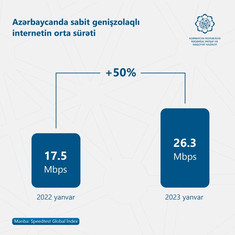 Qeyd edilib ki, artım nəticəsində internetin orta sürəti bu ilin yanvar ayında 26.3 Mbps təşkil edib. Belə ki, ötən ilin eyni dövründə sürət 17.5 Mbps olub. Hesablamalar "Ookla" şirkətinin dünyada geniş tanınan "Speedtest Global İndex" metodologiyasına əsasən aparılıb.