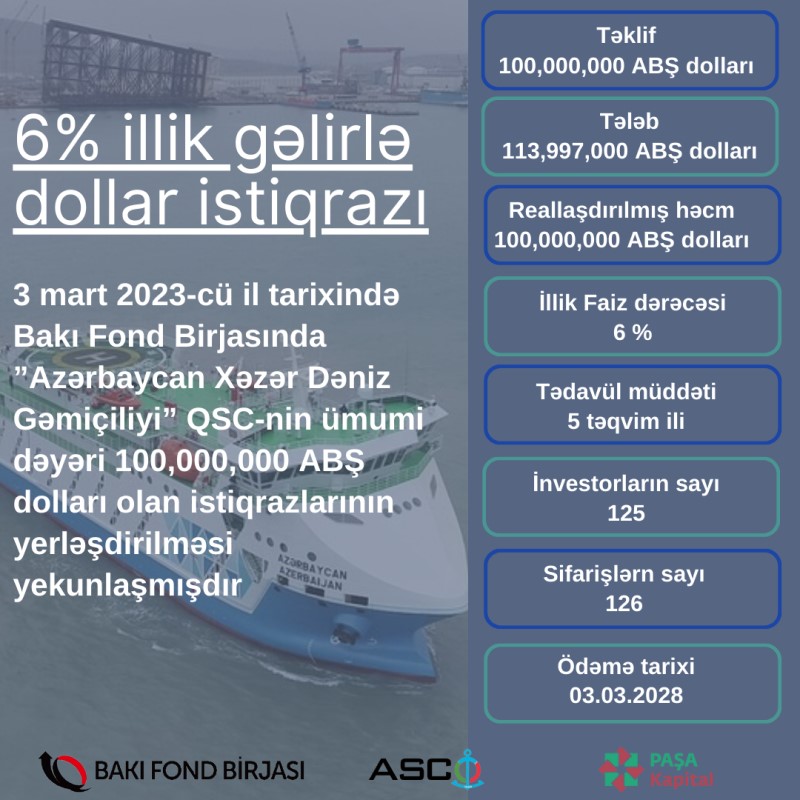 3 mart 2023-cü il tarixində Bakı Fond Birjasında “Azərbaycan Xəzər Dəniz Gəmiçiliyi” QSC-nin (ASCO) tədavül müddəti 5 (beş) təqvim ili olan AZ2001019341 dövlət qeydiyyat nömrəli, 100 milyon ABŞ dolları həcmində, faizli, təmin edilməmiş sənədsiz, adlı istiqrazlarının yerləşdirilməsi uğurla başa çatıb.