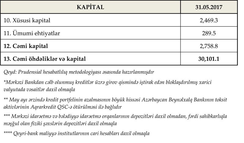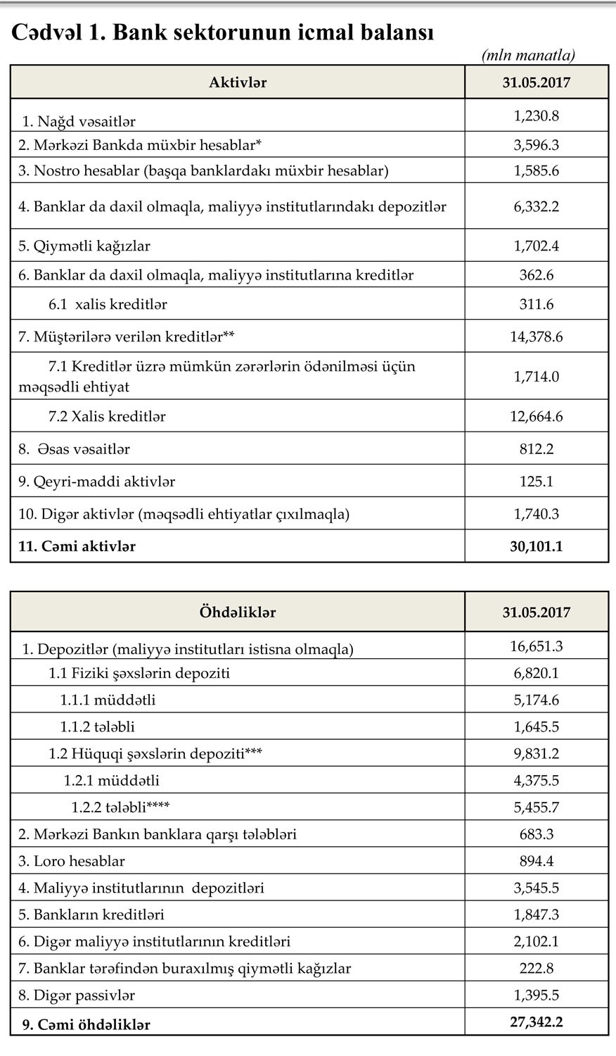 2017-ci ilin 31 may tarixinə olan bank sektorunun əsas göstəriciləri bank sektorunun icmal göstəricilərində öz əksini tapmışdır.