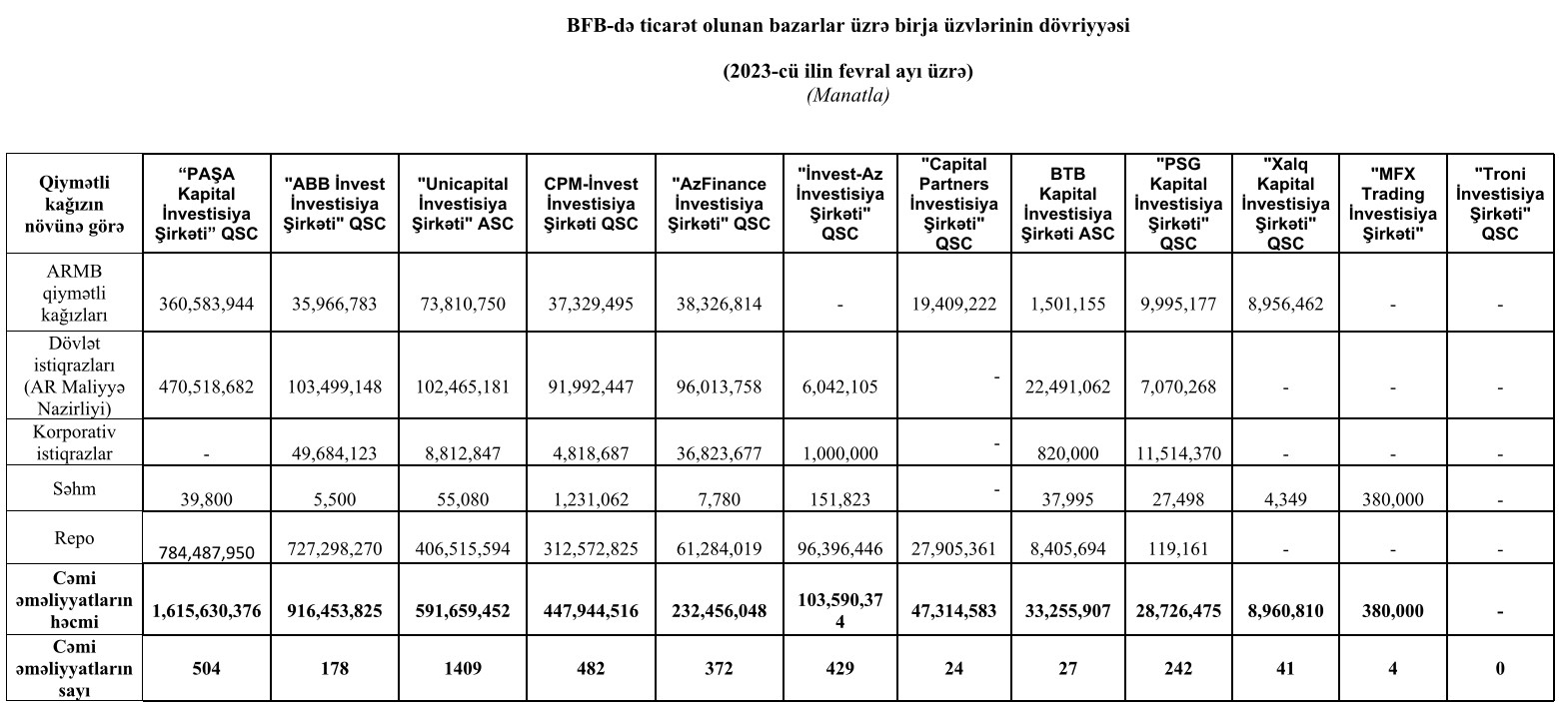 Həmçinin, "ABB İnvest İnvestisiya Şirkəti" QSC 916 milyon 453 min 825 manat dövriyyə ilə 2-ci, "Unicapital İnvestisiya Şirkəti" ASC 591 milyon 659 min 452 manat dövriyyə ilə 3-cü olub.