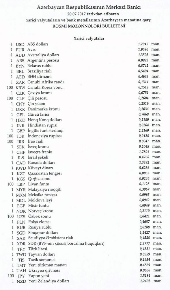 İyulun 20-nə Mərkəzi Bankın açıqladığı rəsmi Dollar/manat məzənnəsi İyulun 19-u ilə müqayisədə dəyişməyərək 1,7017 manat olub, Avro/manat məzənnəsi isə 1.9590 manata düşüb.