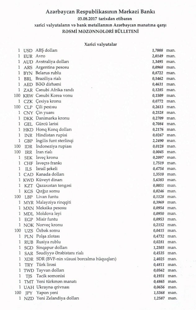 Avqustun 2-də rəsmi olaraq 1 dollar 1,7008 manata, 1 avro isə 2.0112 manata bərabər idi.