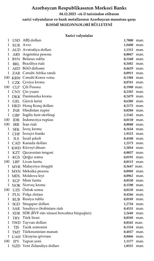 Rəsmi məzənnələr açıqlandı