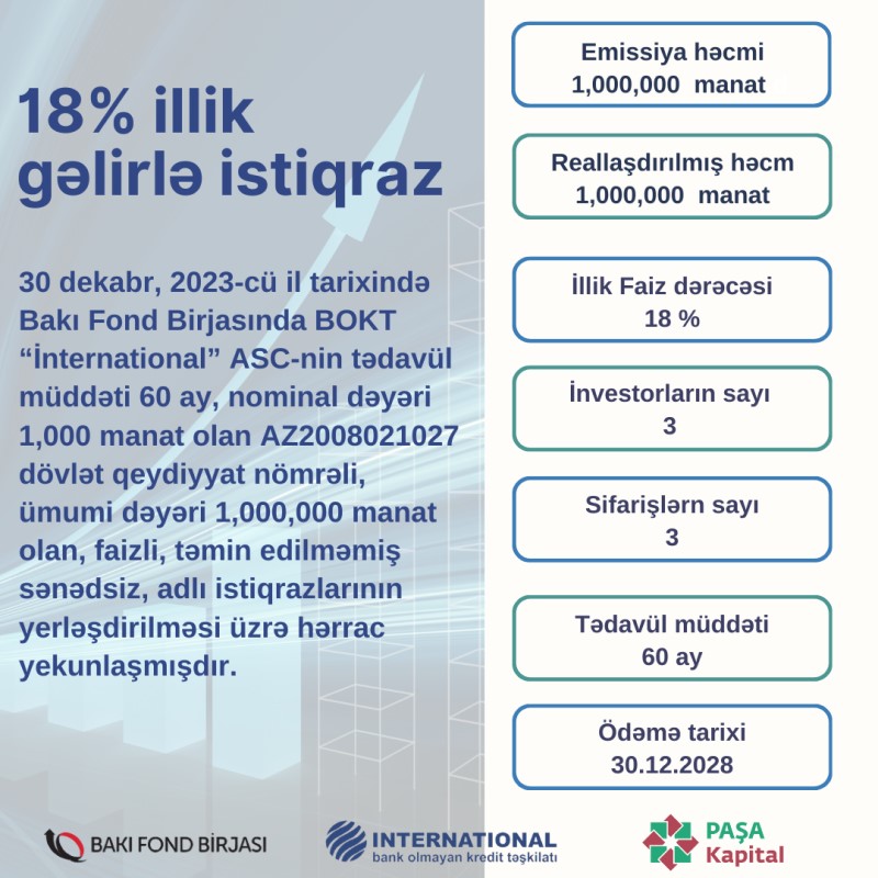BOKT “İnternational” ASC-nin istiqrazlarının yerləşdirilməsi üzrə hərrac keçirilmişdir30 dekabr, 2023-cü il tarixində Bakı Fond Birjasında BOKT “İnternational” ASC-nin tədavül müddəti 60 ay, nominal dəyəri 1000 manat olan AZ2008021027 dövlət qeydiyyat nömrəli, ümumi dəyəri 1 milyon manat olan, faizli, təmin edilməmiş sənədsiz, adlı istiqrazlarının yerləşdirilməsi üzrə hərrac yekunlaşıb.