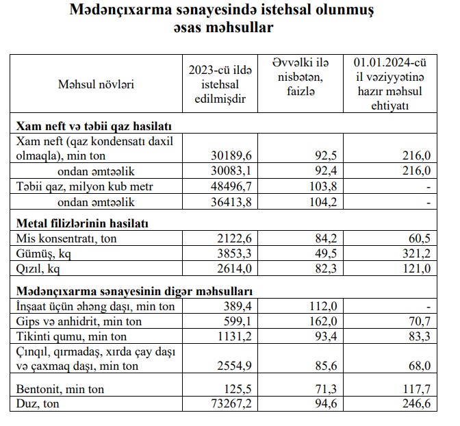 2023-cü ildə Azərbaycanda 2614 kq qızıl, 3853,3 kq gümüş istehsal edilib.