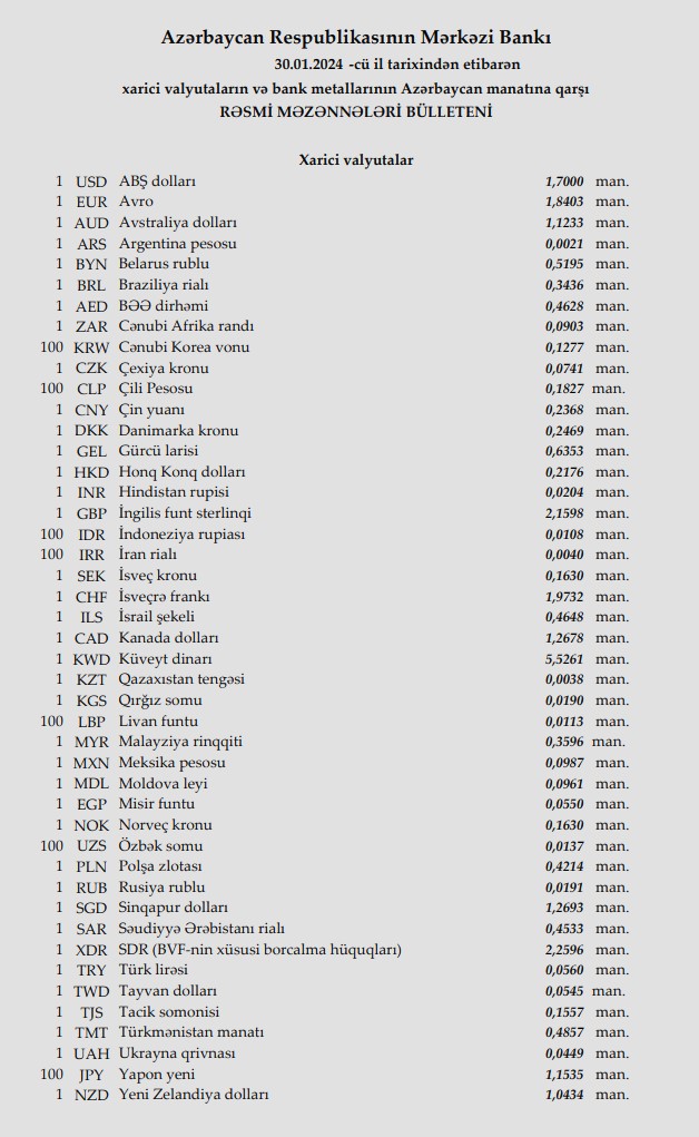 Dolların bazar ertəsi üçün rəsmi məzənnəsi müəyyən olunub