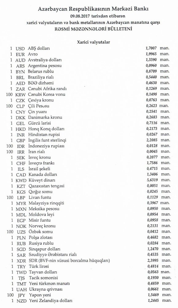 Avqustun 8-də rəsmi olaraq 1 dollar 1,7008 manata, 1 avro isə 2.0092 manata bərabər idi.