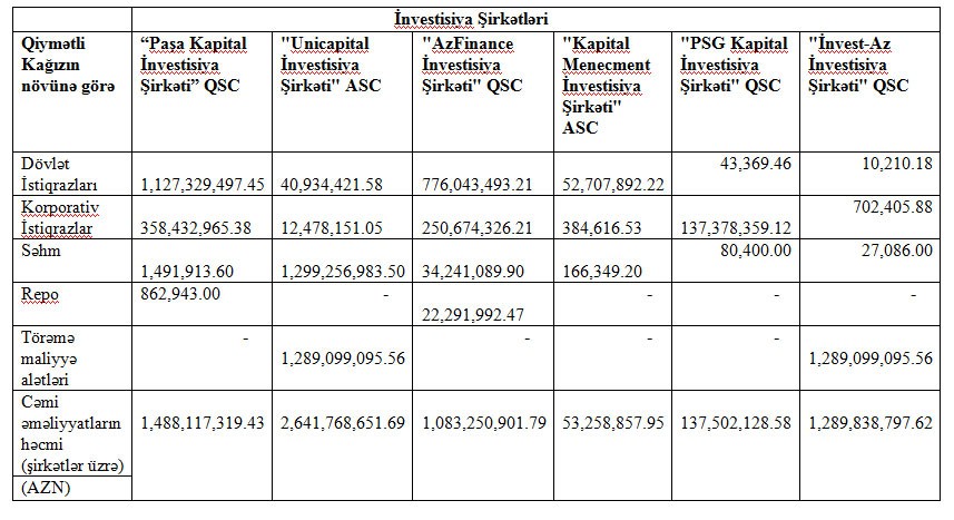“Unicapital” 2 milyard 641 milyon 768,651 min manatlıq dövriyyə ilə birinci, “PAŞA Kapital” 1 milyard 488 milyon 117,319 min manat dövriyyə ilə ikinci yeri tutub.