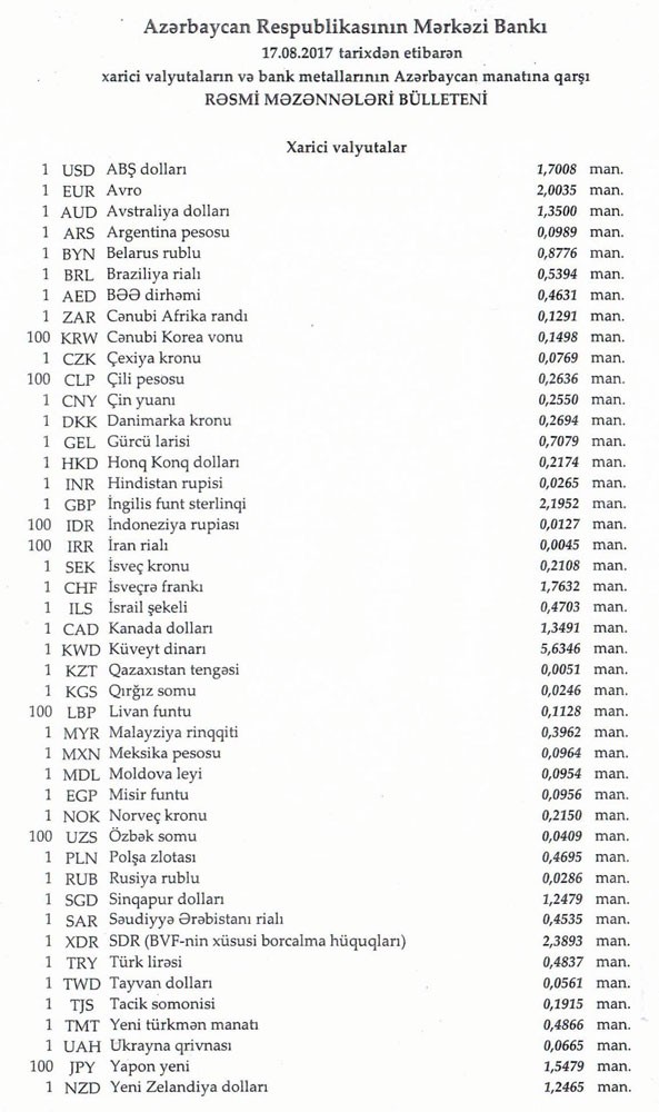 Avqustun 17-nə Mərkəzi Bankın açıqladığı rəsmi Dollar/manat məzənnəsi Avqustun 16-sı ilə müqayisədə dəyişməyərək 1,7008 manat olub, Avro/manat məzənnəsi isə 2.0035 manata qalxıb.