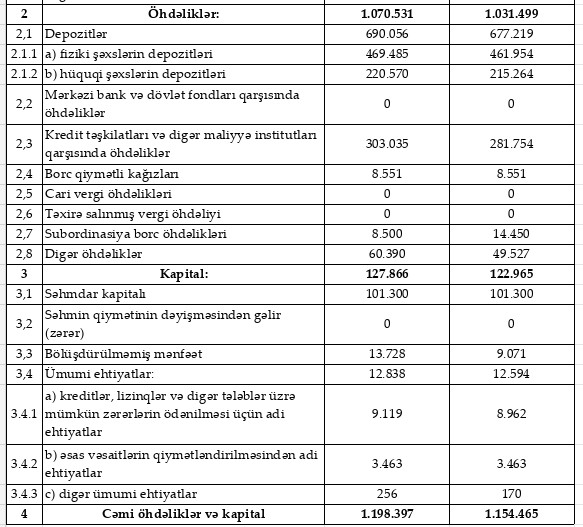 2024-cü ilin sonu ilə müqayisədə ilk rübdə "Rabitəbank"ın cəmi aktivləri 43 milyon 932 min manat artaraq 1 milyard 198 milyon 397 min manata, cəmi depozitlər isə 12 milyon 837 min manat artaraq 690 milyon 056 min manata çatıb.