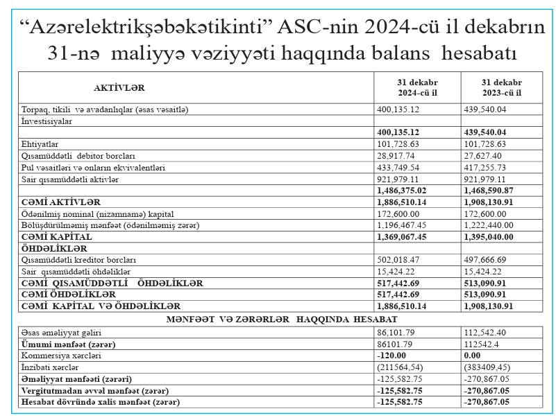 “Azərelektrikşəbəkətikinti” ASC-nin 2024-cü il dekabrın 31-nə maliyyə vəziyyəti haqqında balans hesabatı