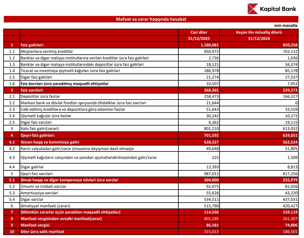 "Kapital Bank" ASC 2025-ci ili 315 milyon 13 min manat xalis mənfəət ilə başa vurub. Bank 2024-cü ili 186 milyon 501 min manat xalis mənfəət ilə bağlamışdı. Beləliklə, "Kapital Bank"ın xalis mənfəəti 2025-ci ildə 2024-cü illə müqayisədə 128 milyon 512 min manat və ya 68,9% artıb.