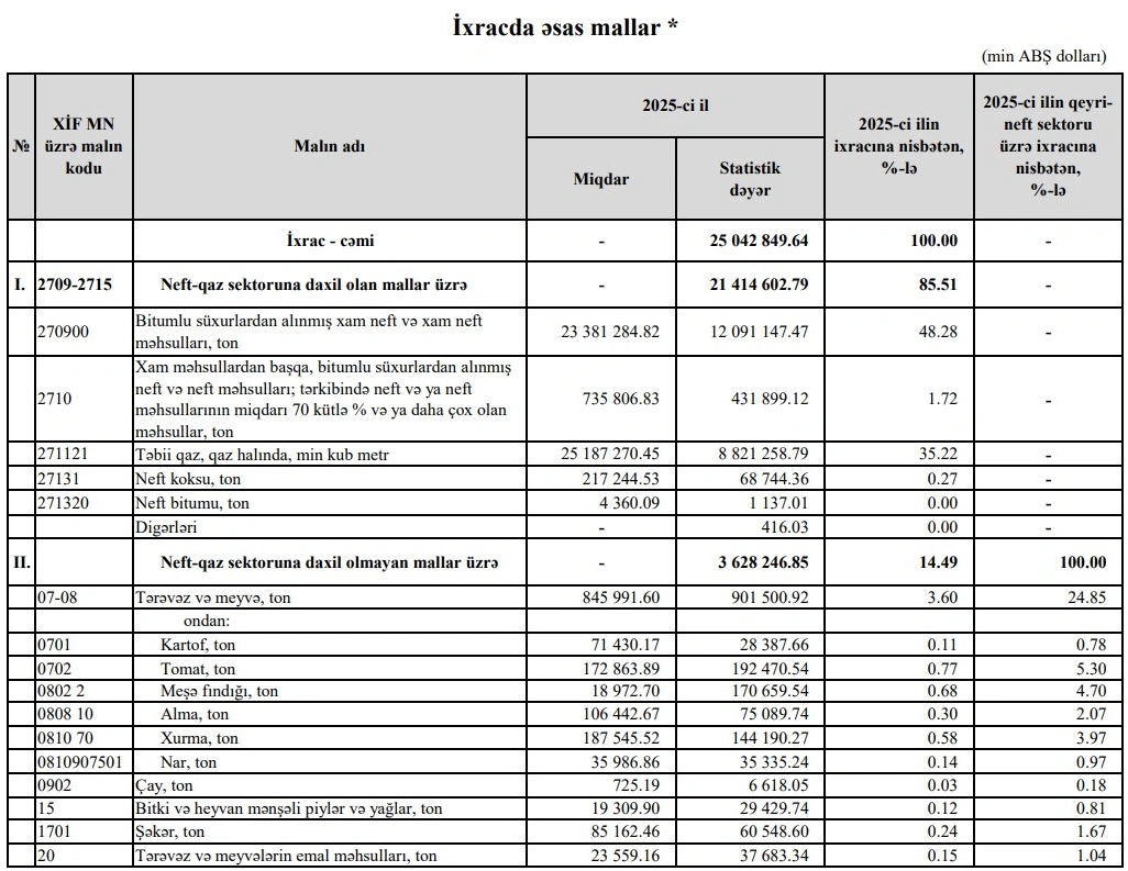 2025-cü ilin yanvar-dekabr aylarında (12 ayda) Azərbaycanın ən çox ixrac və idxal etdiyi mallar.
