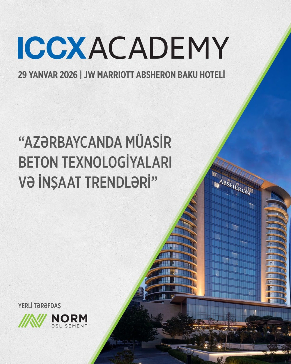 Zəngin bilik və təcrübələrin bölüşüldüyü “ICCX Academy Baku” beynəlxalq beton konfransı və sərgisi Azərbaycanda keçirilən və Norm şirkətinin ev sahibliyi etdiyi üçüncü belə tədbir olacaq. Bundan öncə 2019 və 2023-cü illərdə keçirilmiş tədbirlər beton və inşaat sahəsinin yerli və beynəlxalq mütəxəssislərini bir araya gətirərək, sənayedəki yeniliklərlə bağlı məlumat mübadiləsinə şərait yaratmışdı. Bu dəfə də “ICCX Academy Baku” sektorun gələcəyinə yön verən yeni ideyaların və innovativ yanaşmaların müzakirəsini dəstəkləyən peşəkar dialoq platforması rolunu oynayacaq.