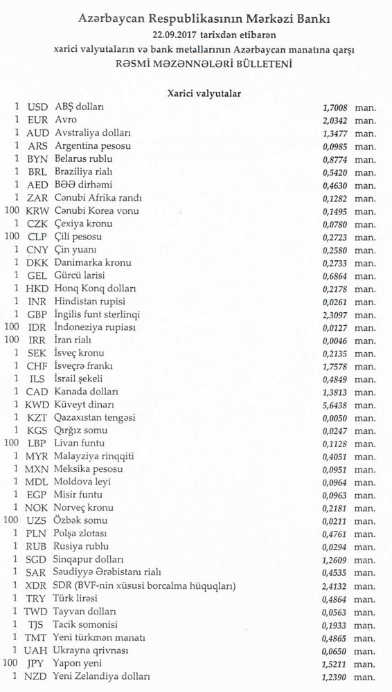 Sentyabrın 21-də rəsmi olaraq 1 dollar 1,7008 manata, 1 avro isə 2.0209 manata bərabər idi.