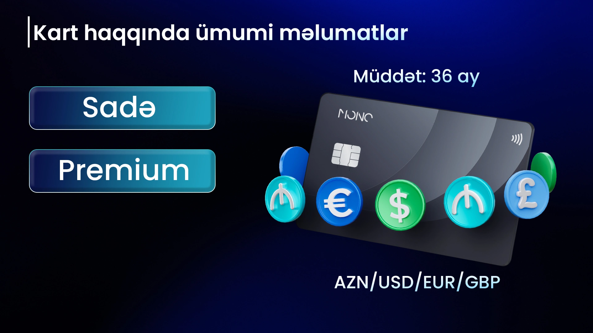 Marja.az-ın məlumatına görə, kartın təqdimat mərasimində "AFB Bank"ın Pərakəndə bankçılıq mərkəzinin icraçı direktoru Pərviz Qasımov bildirib ki, "Mono kart" bazara "Sadə" və "Premium" olaraq 2 variantda təqdim edilir: ""Sadə" kartımız tamamilə pulsuzdur. "Premium" kartı isə balansa 500 manat mədaxil edilməsi şərtilə əldə etmək olar".