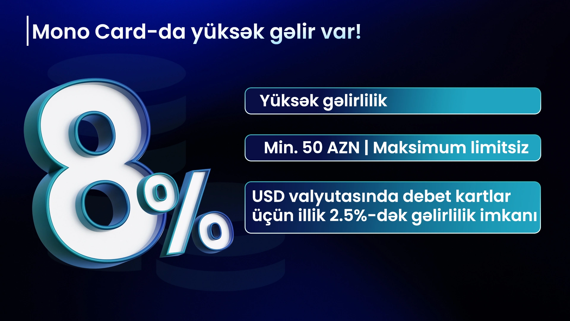 "Yəni müştəri öz vəsaitini manatla bu kartda saxlayaraq illik 8% gəlir əldə edə bilər. Minimum məbləğ 50 manatdır, maksimum limit isə yoxdur. ABŞ valyutasında kartda saxlanılan vəsaitə isə illik 2,5% gəlir hesablanır".