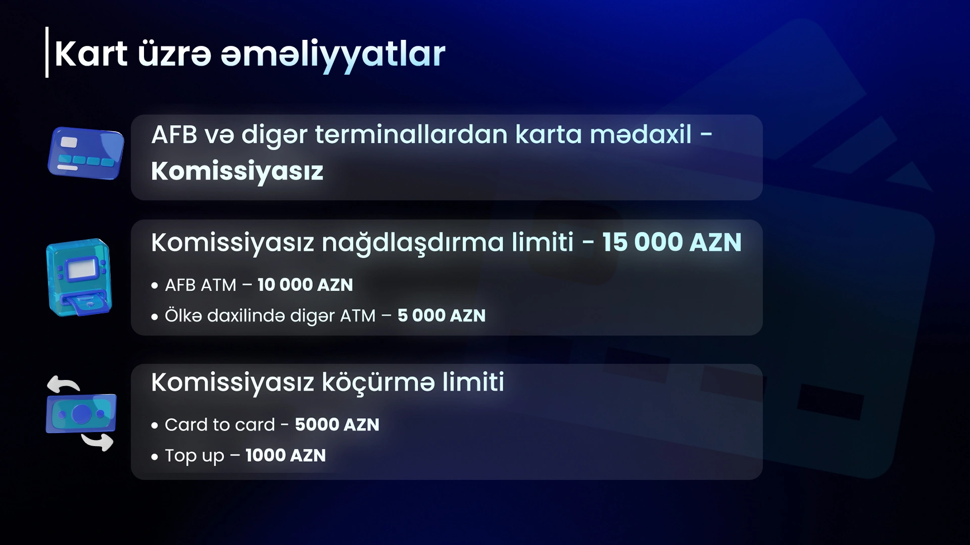 Komissiyasız köçürmə limiti (card to card) aylıq 5000 manatdır. Digər bankın emissiya etdiyi ödəniş kartının və elektron pul kisəsinin balansının artırılması (TOP UP) üzrə aylıq limitsiz məbləğ 1000 manatdır.