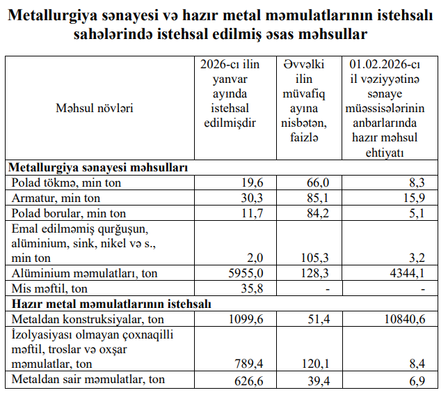 Metallurgiya sənayesi və hazır metal məmulatlarının istehsalı sahələrində 2026-сı ilin yanvar ayında 104,7 milyon manatlıq məhsul istehsal olunmuş, əvvəlki ilin müvafiq ayı ilə müqayisədə metallurgiya sənayesi məhsullarının istehsalında 3,9 faiz, hazır metal məmulatlarının istehsalı sahəsində isə 28,5 faiz azalma müşahidə olunmuşdur. 2026-сı ilin yanvar ayında metallurgiya sənayesi üzrə armatur istehsalı 14,9 faiz, polad tökmə istehsalı 34,0 faiz, hazır metal məmulatlarının istehsalı sahəsi üzrə metaldan sair məmulatların istehsalı isə 60,6 faiz azalmışdır.