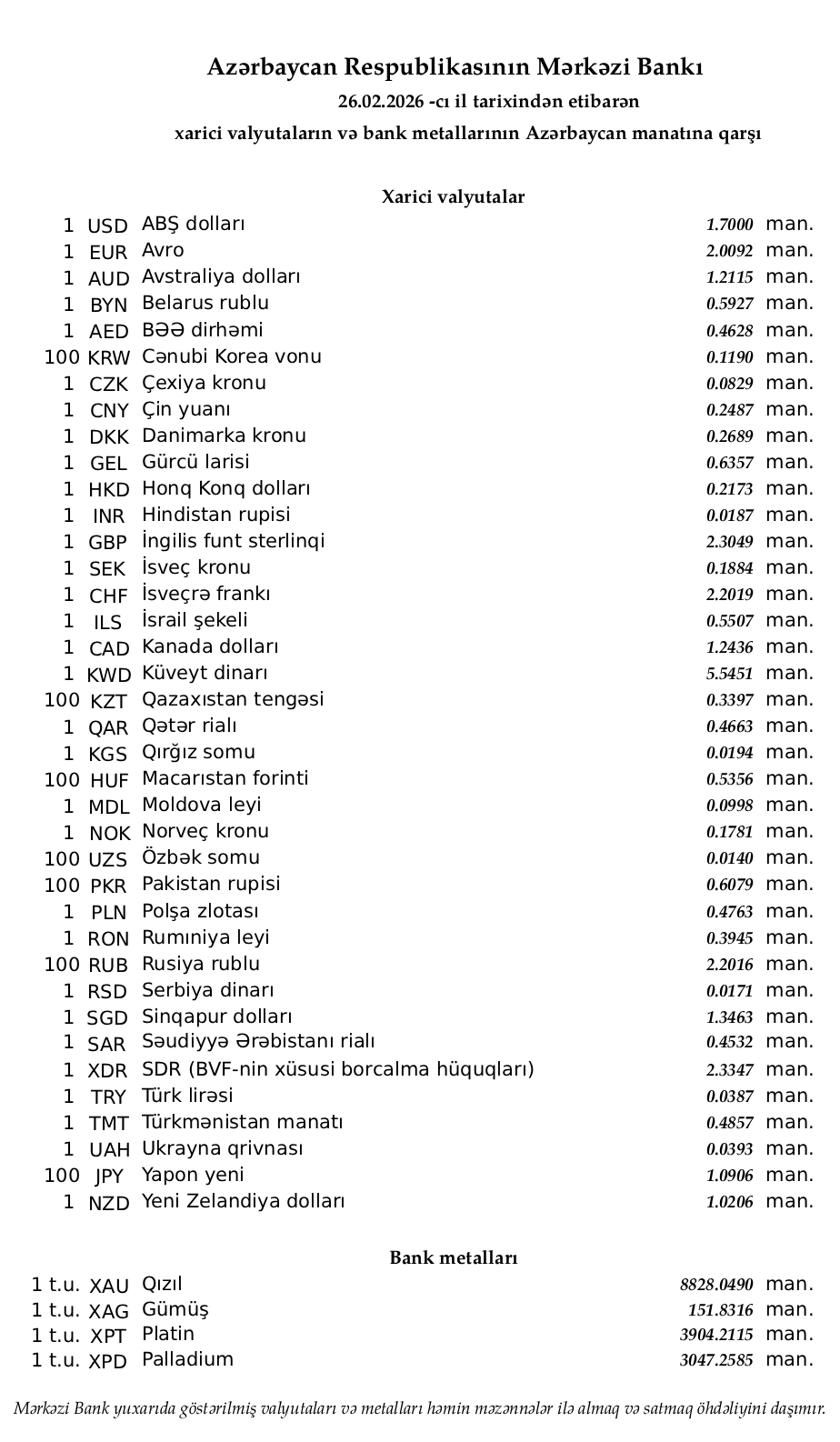 Rəsmi məzənnələr açıqlandı