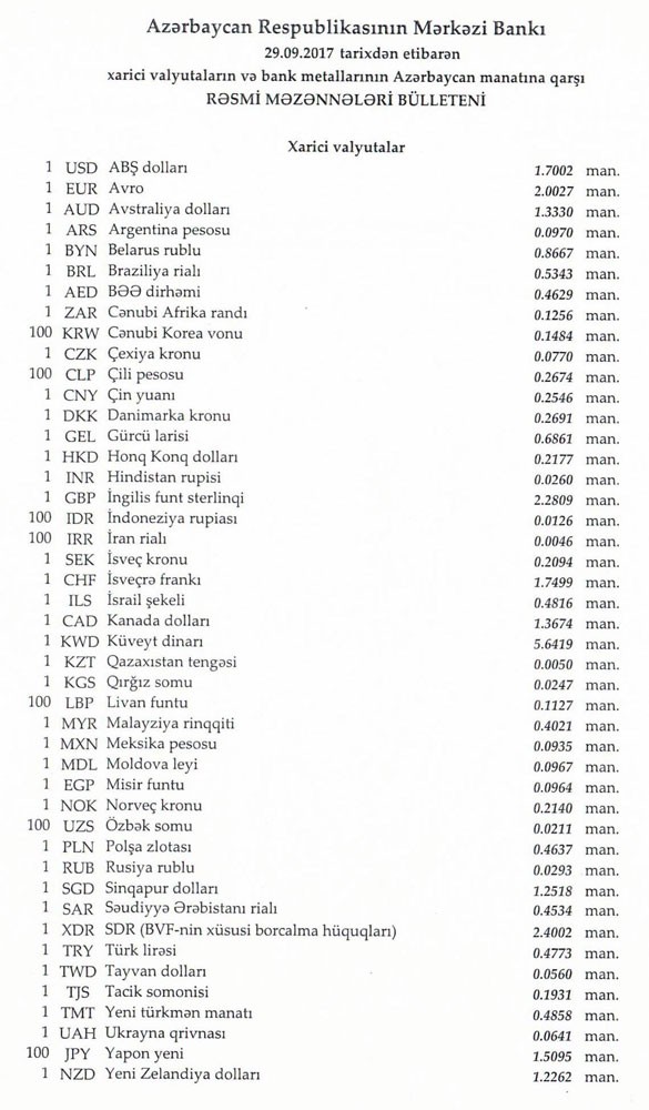 Sentyabrın 28-də rəsmi olaraq 1 dollar 1,7002 manata, 1 avro isə 1.9946 manata bərabər idi.