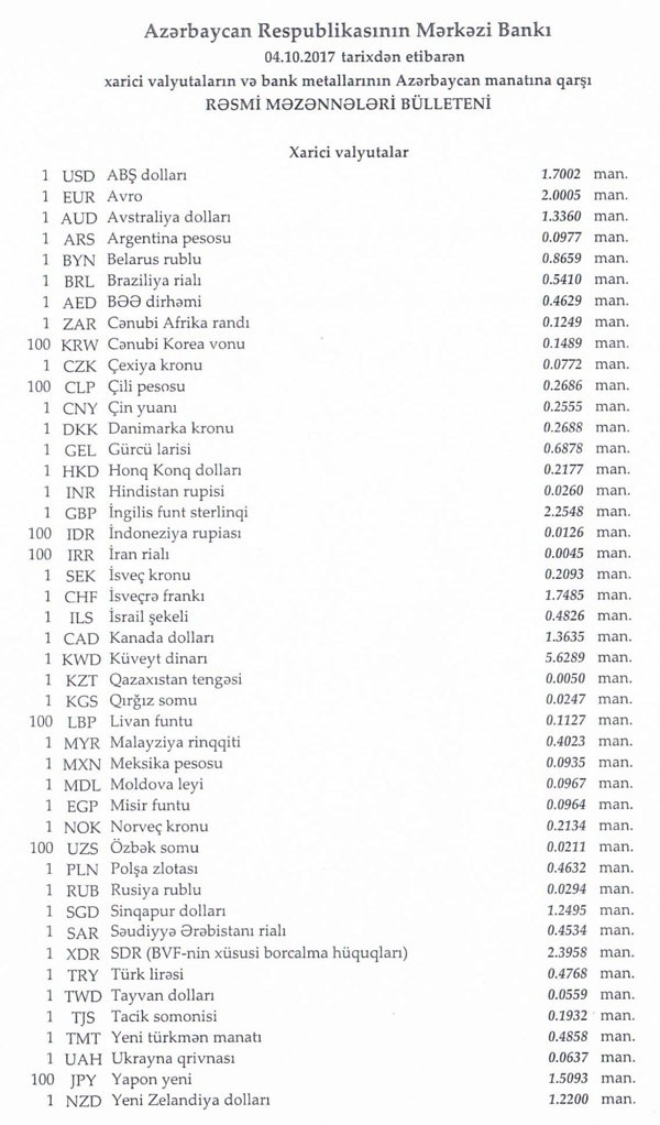 Oktyabrın 3-də rəsmi olaraq 1 dollar 1,7002 manata, 1 avro isə 1.9904 manata bərabər idi.