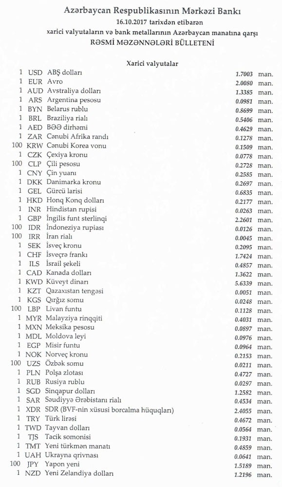 Oktyabrın 16-na Mərkəzi Bankın açıqladığı rəsmi Dollar/manat məzənnəsi Oktyabrın 13-ü ilə müqayisədə dəyişməyərək 1,7003 manat olub, Avro/manat məzənnəsi 2.0080 manata düşüb, Rubl/manat məzənəsi isə 0,0297 manata qalxıb.