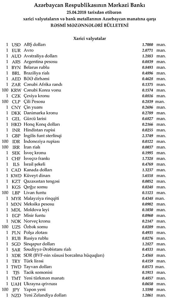2018-ci ilin Aprel ayının 25-nə Mərkəzi Bankın açıqladığı rəsmi Dollar/manat məzənnəsi Aprelin 24-ü ilə müqayisədə dəyişməyərək 1,7000 manat olub, Avro/manat məzənnəsi 2.0771 manata, Rubl/manat məzənəsi isə 0,0276 manata qalxıb.