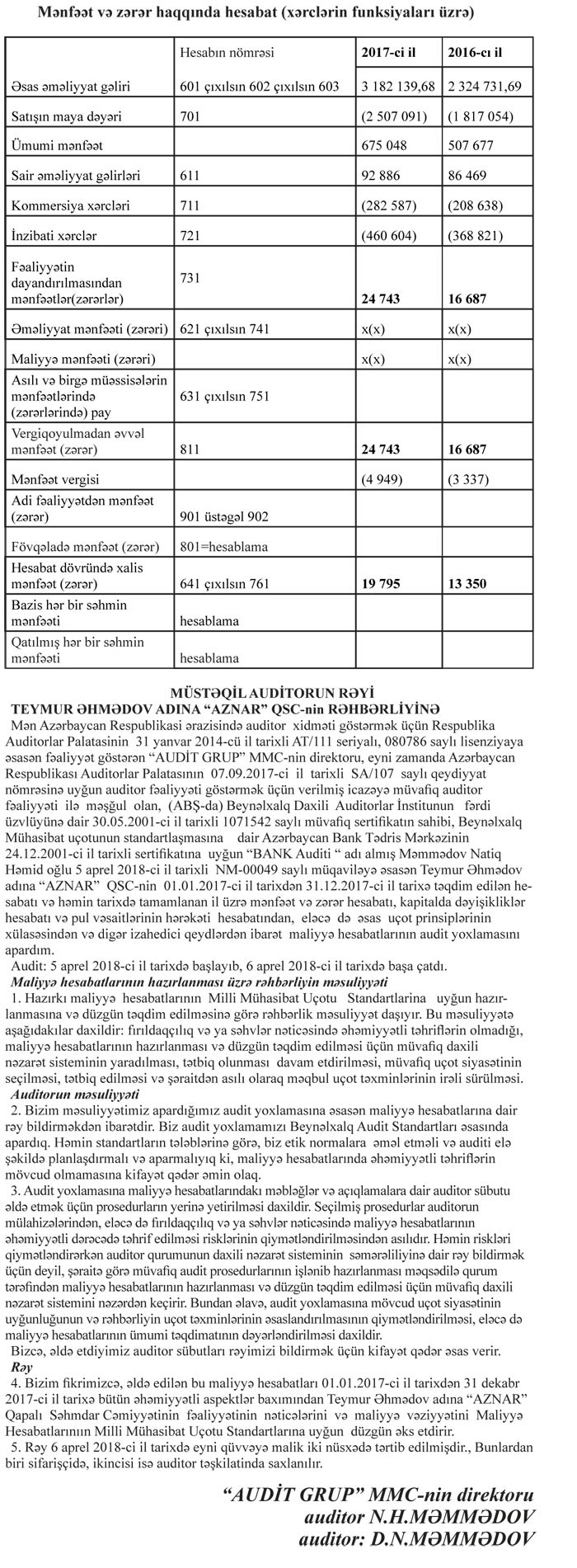 Əməliyyat və digər xərclər çıxıldıqdan sonra “AZNAR”ın vergidən əvvəl 24 min 743 manat mənfəəti qalıb. 2016-cı ildə bu məbləğ 16 min 687 manat təşkil etmişdi. 9 min 949 manat mənfəət vergisi ötənildikdən sonra, QSC ötən ili 19 min 795 manat xalis mənfəətlə bağlayıb. 2016-cı ildə xalis mənfəət 13 min 350 manat təşkil etmişdi. Satışlar artsa da mənfəət cüzidir.